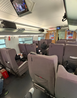 一等座座位大,宽,可以插充电大头(适合办公人员,一个座位独立便携折叠小桌子)