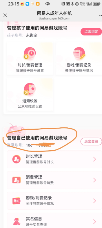 忽略上半部分“管理孩子使用的网易账号”,直接到下面点击“管理自己使用的网易账号”,开始设置管理密码、进行“时长管理”,见P4