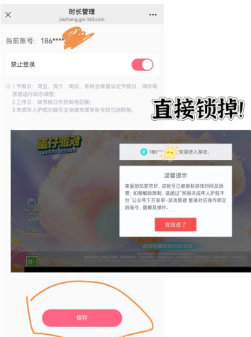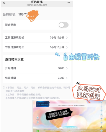 时长管理里按需设置,游戏实时体现,而且,无论怎么更新设置时长都会把今天已经使用的时间算进去!见P5,很好用!如果设置禁止登陆就会出现P6的情况。