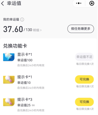 最重要的是,每天的10次猜盒机会,在没有DIMOO精灵辅助的情况下,猜盒猜错+1幸运值,猜对+3幸运值。全部猜对每日保底可以高达30的幸运值。用于兑换大量的提示卡。