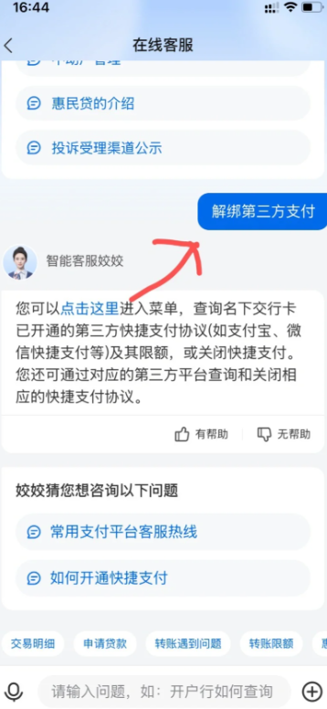 2,输入“解绑第三方支付”,智能客服会进行回答(图二),点击链接进入界面(图三)