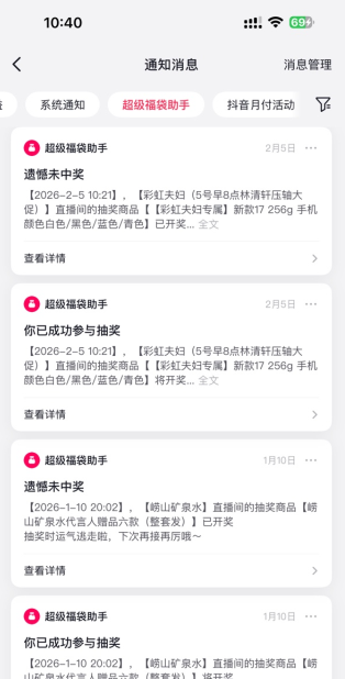在抖音抢到福袋却找不到中奖记录?别急,其实查看入口很简单。由于福袋分主播发和品牌发两种,查看路径会略有不同。不过最直接的方法就是点开你的“消息”页,留意“官方系统通知”,中奖信息通常都藏在这里。