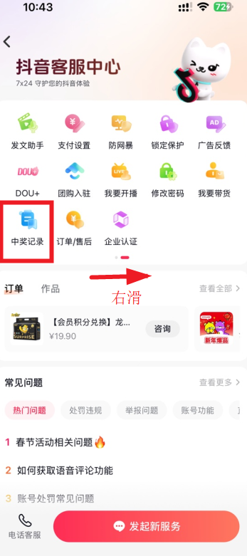 5,右滑找到中奖记录,点击进入;
