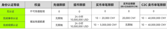 有关不同身份认证等级的充提币限额可参考下图: