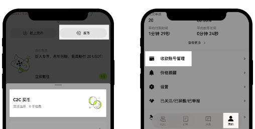 绑定收付款方式: 打开欧易 App,点击【买币】-【C2C买币】-右下角【我的】图标-【收款账号管理】。