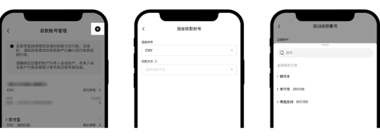 点击右上角“+”—【选择货币】、【收款方式】—可选择银行卡/支付宝/微信支付三种方式,按要求填写相关信息和提示即可完成绑定。