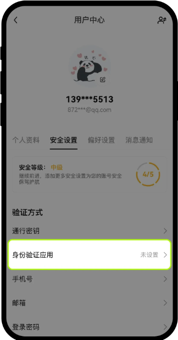 注意:如需更换绑定的手机号或邮箱可在用户中心点击【安全设置】—【身份验证应用】,按提示完成修改。