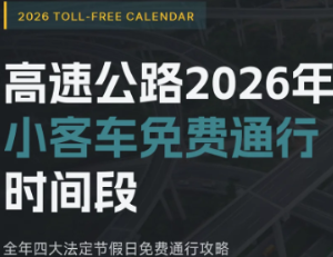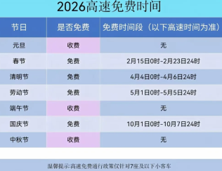 2026年高速免费通行时间表适用车辆:7座及以下小型客车(含营运车辆和非营运车辆),以及允许在普通收费公路行驶的摩托车。